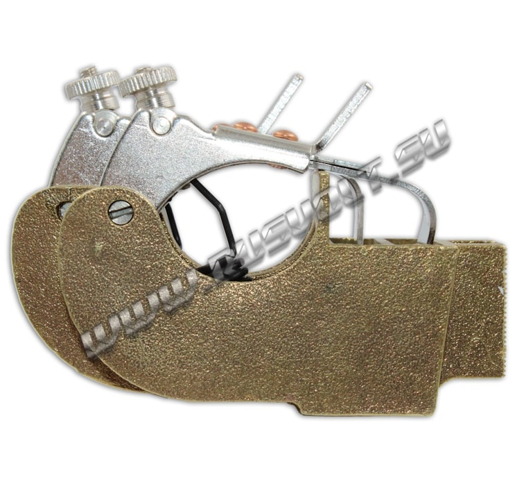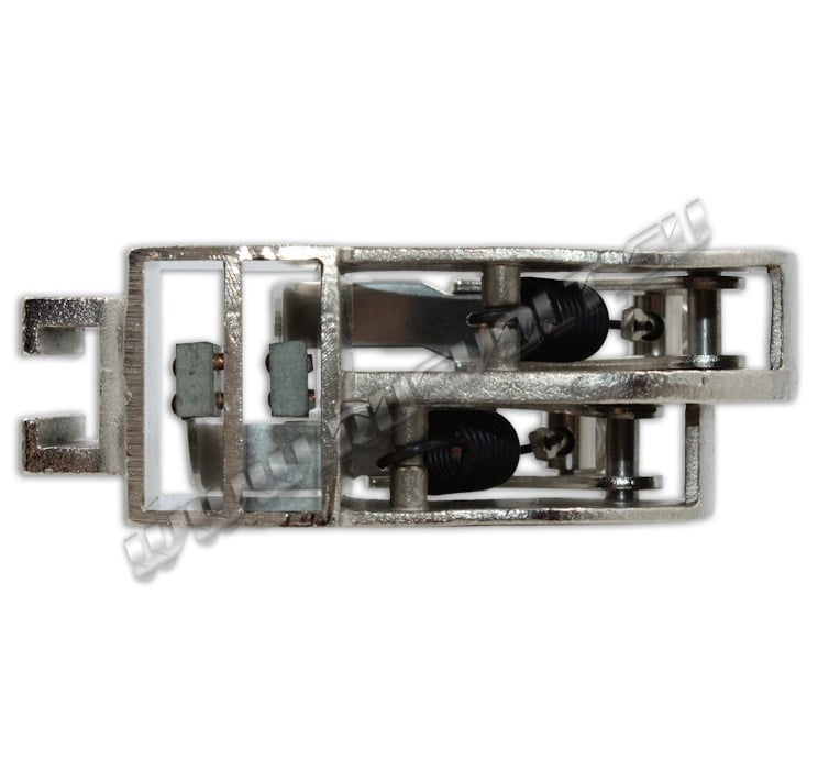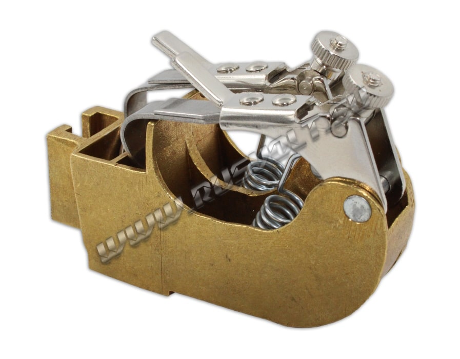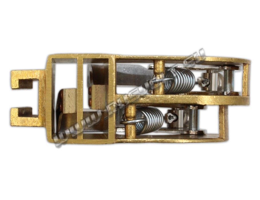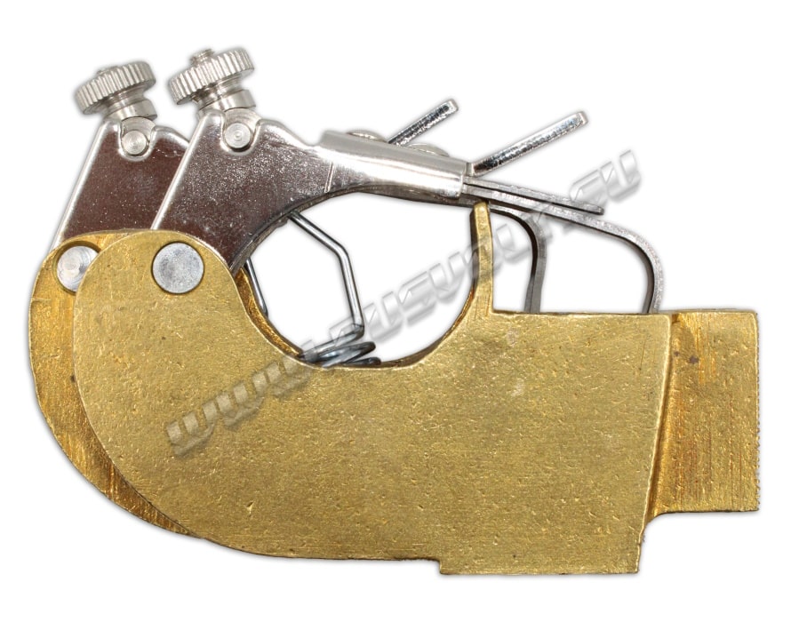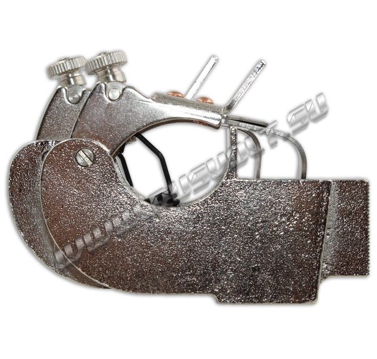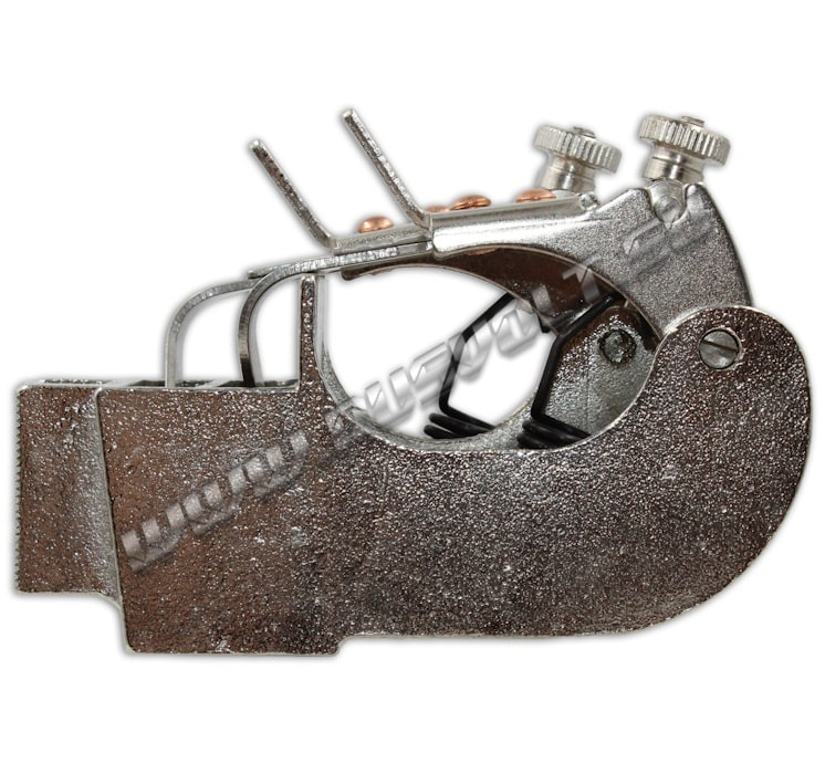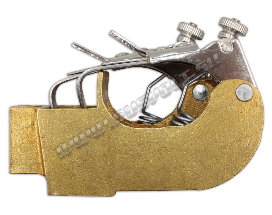 Щёткодержатель TNC-RV 2/10х32 (возможные аналоги TNC3-1032 10х32 Schunk чертеж 06.07.0094.14 и TTo7-1032 10х32 Mersen (Carbon Lorraine)) состоит из двух скошенных обойм и двух нажимных устройств, обеспечивающих прилегание щеток к коллектору с необходимым усилием. Давление регулируемое и на графитовые щетки передаётся при помощи двух рычагов с цилиндрическими пружинами растяжения, наконечники рычагов изготовлены из текстолита. Сам щеткодержатель крепится на бракет (траверсу). Изготавливается под давлением из латуни или стали с помощью фрезерной обработки путем протяжки, сверления и запиловки.