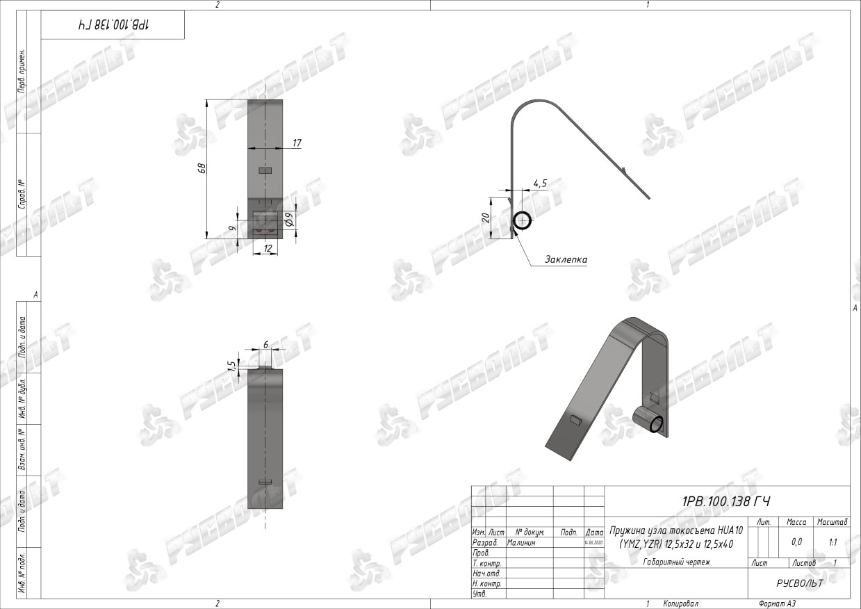 Пружина рулонная (спиральная) часового типа, используется в составе щеткодержателя HUA10 12,5х32 и щеткодержателя HUA10 12,5х40 которые входят в состав узлов токосъема для электродвигателей китайского производства. При помощи нее осуществляется давление на графитовую электрощётку марки J201 12,5х32х50 и J201 12,5х40х50 либо щетку J164 12,5х32х50 и J164 12,5х40х50. Крепится прижимное устройство непосредственно в окне щеткодержателя. Изготавливается из стали методом штамповки. На один щеткодержатель устанавливается по 2 пружины данного типа, то есть по одному прижимному устройству для каждой щетки китайского производства.