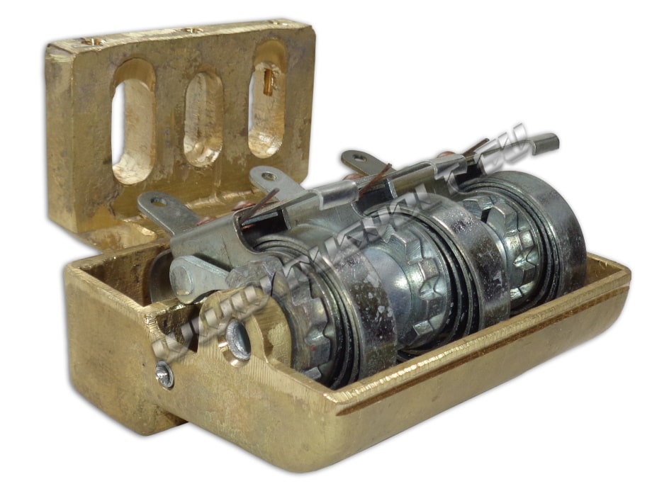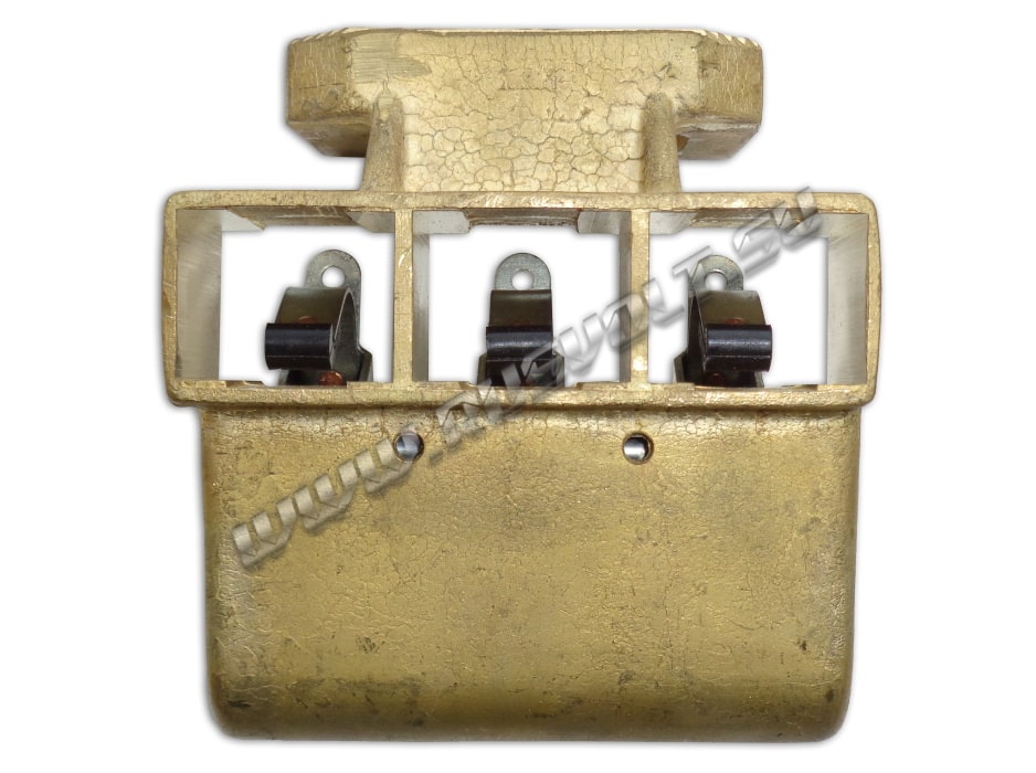 Щёткодержатель типа ТЕ006 3/25х32 чертеж ТЗ.039.04.33.00 или Т463.62.69.00 состоит из корпуса, который имеет три окна для электрощеток размером 25х32 мм, а так же трех нажимных пальцев на концах которых есть резиновые амортизаторы. Корпус отлит из латуни марки, пальцы сделаны из стали. Усилие нажатия пальцев на электрощетки делают три спиральные пружины часового типа. Кинематика всего нажимного механизма позволяет регулировать силу нажатия пальцев на электрощетки по мере их износа. В окна данного щеткодержателя вставляются три щетки размером 25х32 мм либо 2/12,5х32 мм.