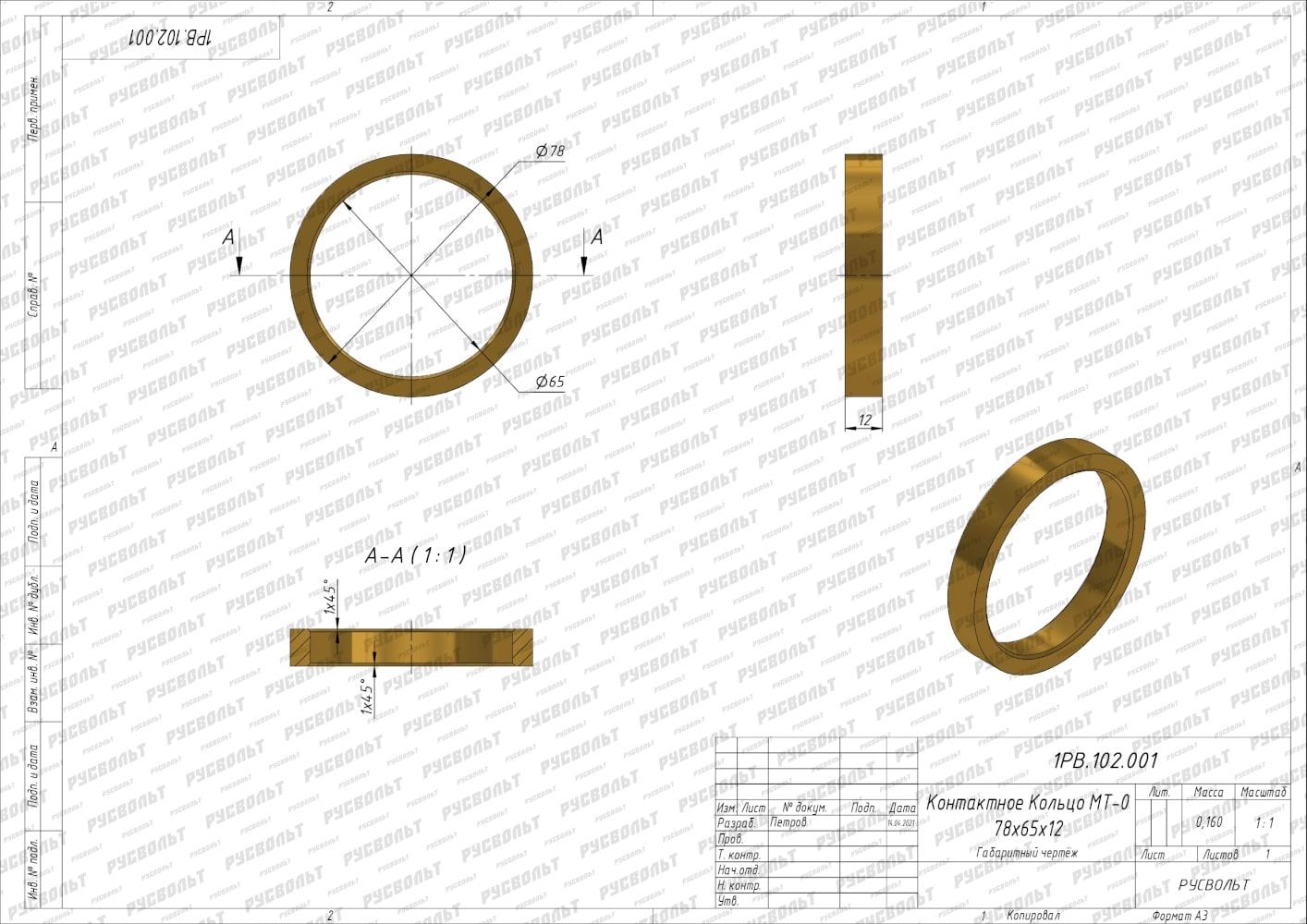 Токосъемное контактное кольцо МТ0 78х65х12 (0 габарит) - чертеж 1РВ.102.001 ГЧ