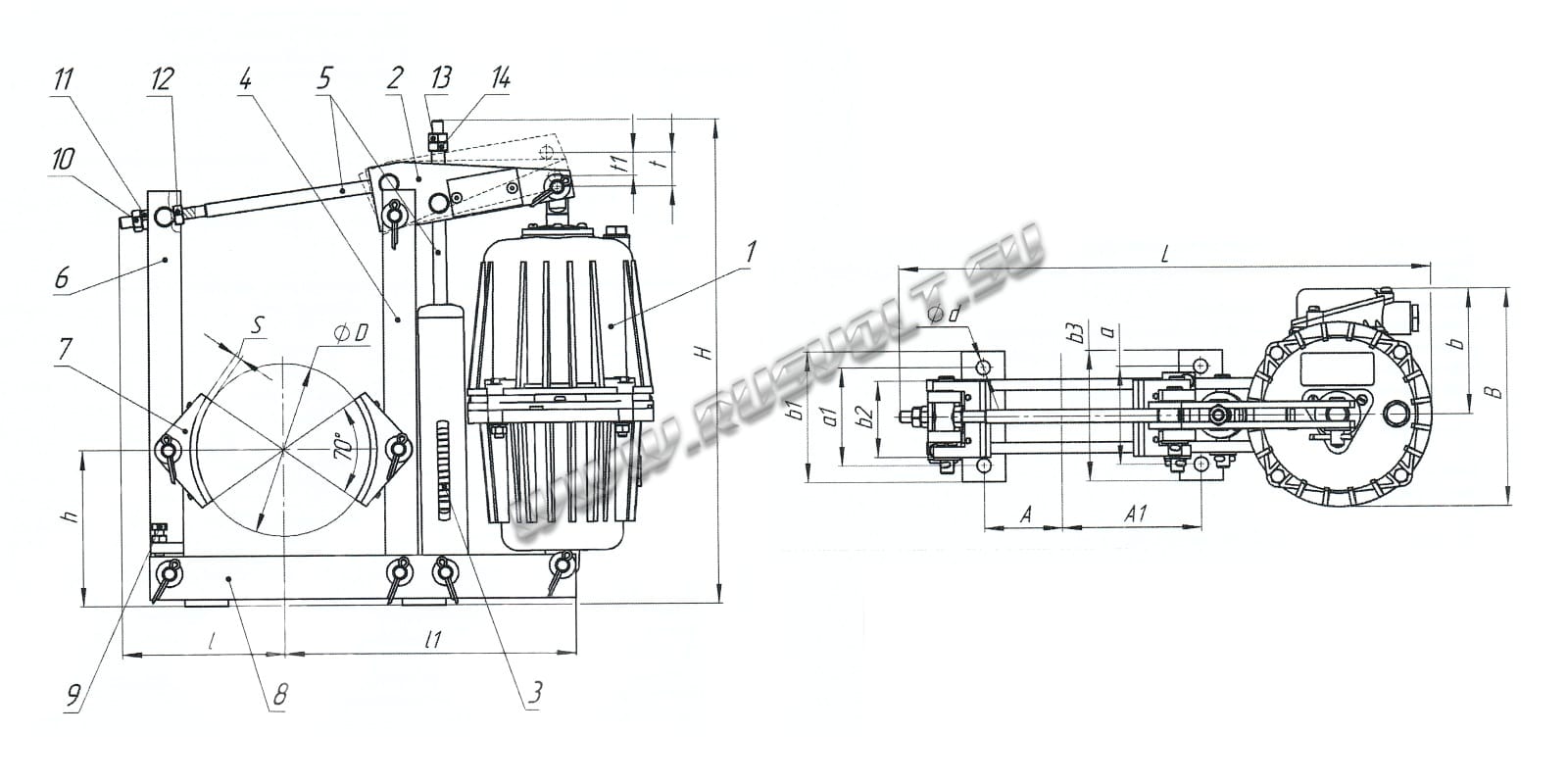 Конструкция тормоза колодочного ТКГ для крана представлена на вышеприведенном чертеже. В её состав входит механическая часть и сам толкатель ТЭ (1). Детальное описание его конструкции приведено ниже: