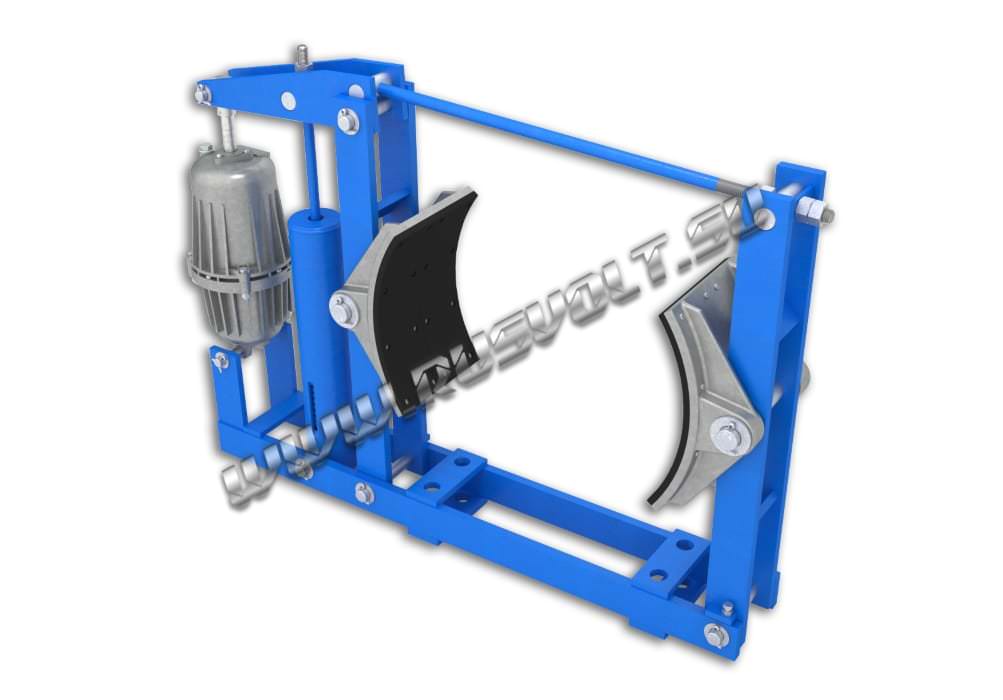 Включение толкателя электрогидравлического (1) сопровождается движением его поршня преодолевающего сопротивление пружины (3) и раздвигающего стойки (4; 6), на которых расположены тормозные колодки (7), через рычаги (2; 5). В момент растормаживания шкива шток толкателя будет находиться в верхнем положении.