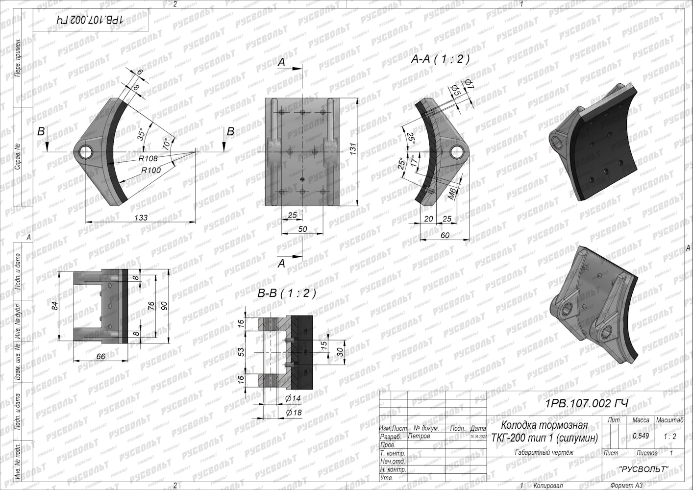Тормозная колодка ТКГ200 (ТКТГ200, ТКТ200 и ТКП200) тип 1 (чертеж 1РВ.107.002 ГЧ)