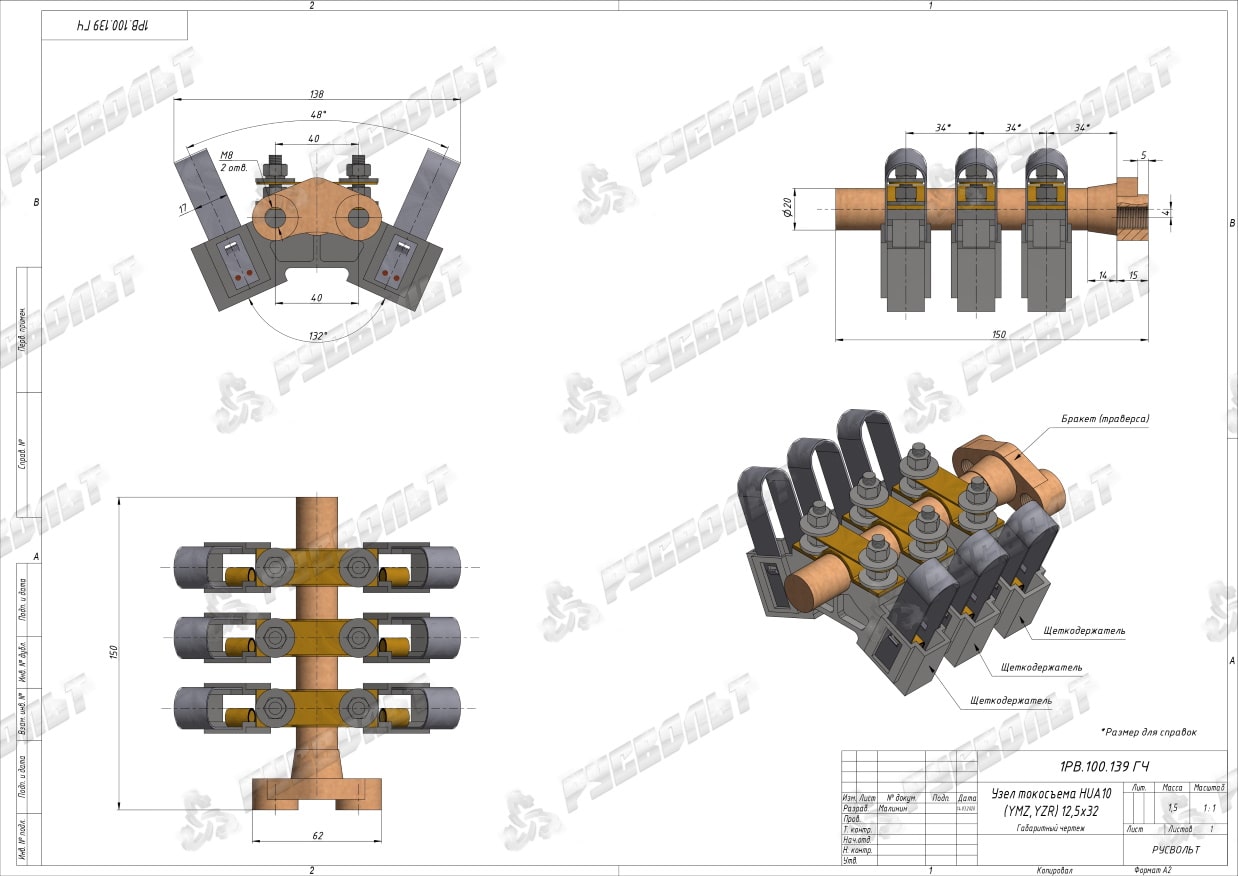 Узел токосъема HUA10 (YZR, YMZ) 12,5х32 состоит из трех щеткодержателей в каждом из которых два окна с размером под щетки J164 12,5х32х50 или J201 12,5х32х50 и из бракета HUA10 12,5х32 (траверсы). Давление на графитовые электрощётки передается с помощью рулонной пружины HUA10 12,5х32 часового типа которые в свою очередь прилегают к блоку контактных колец. Используется он с блоком токосъемных колец 5МТ 85х142х125 мм. Каждый щеткодержатель HUA10 12,5х32 крепится на круглый палец (бракет). Изготавливается данный узел под давлением из силумина при помощи фрезерной обработки путем протяжки, сверления и запиловки. На один электродвигатель устанавливается один данный узел токосъема, то есть 1 бракет, 3 щеткодержателя и 6 электрощеток.